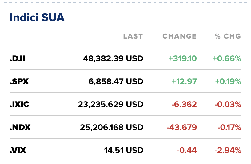 Indicele de referință a urcat cu 0,19%, la 6.858 de puncte, în timp ce indicele Nasdaq Composite a închis practic neschimbat, după ce ambele se menținuseră solid pe plus mai devreme în cursul zilei, cu S&P 500 în creștere cu până la 0,7%, iar Nasdaq, dominat de companii de tehnologie, cu până la 1,5% pe plus la maximele zilei. Dow Jones Industrial Average a câștigat 319 puncte, respectiv 0,66%, închizând la 48.382 de puncte.