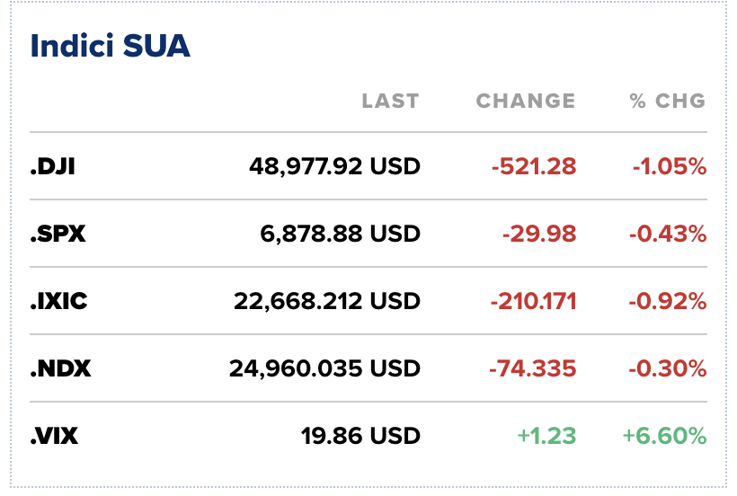 Toți indicii majori au înregistrat pierderi vizibile la finalul săptămânii. Dow Jones Industrial Average a condus declinul, coborând cu 1,05% până la 48.977 de puncte. Nasdaq Composite a scăzut cu 0,92%, iar S&P 500 a pierdut 0,43%, închizând la 6.878 de puncte.