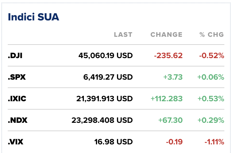 Astfel, indicele Nasdaq Composite se situa în zona verde, spre final de sesiune, cu 0,5%, S&P 500 cu 0,1%, în timp ce Dow Jones scădea cu 235 de puncte, adică 0,5%.