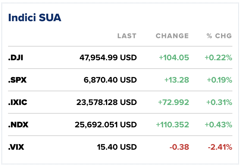 Indicele S&P 500 a urcat cu 0,19%, la 6.870 de puncte, consemnând a noua sesiune pozitivă din ultimele zece. Nasdaq Composite a crescut cu 0,31%, în timp ce Dow Jones a avansat cu 0,22%, la aproape 48.000 de puncte.