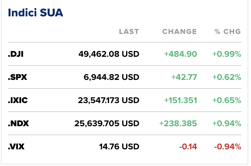 S&P 500 a avansat cu 0,64%, atingând un nou maxim istoric intra-day, în timp ce indicele Dow Jones a crescut cu aproape 600 de puncte, adică 1,23%, marcând, la rândul său, un maxim intra-day. Indicele de tehnologie Nasdaq Composite a urcat cu 0,7%, susținut de revenirea sectorului inteligenței artificiale.