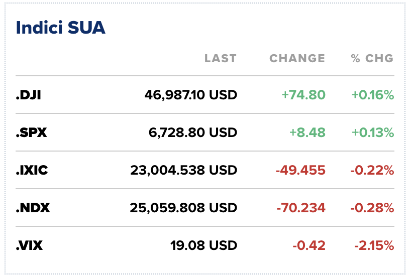Nasdaq Composite, indicele axat pe tehnologie, a scăzut cu 0,22%, în timp ce atât S&P 500, cât și Dow Jones, au încheiat ușor pe plus: 0,13%, respectiv 0,16%, cu Dow închizând la aproape 47.000 de puncte. Mai devreme în cursul zilei, Nasdaq scăzuse cu până la 2,1%.
