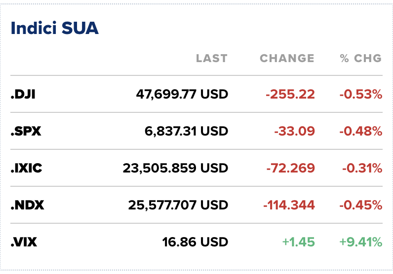 Indicele Dow Jones Industrial Average a condus scăderile, pierzând 255 de puncte (0,53%) spre finalul sesiunii, în timp ce S&P 500 a corectat cu 0,48%. Indicele Nasdaq Composite, dominat de sectorul tehnologie, se situa, de asemenea, pe minus, scăzând cu 0,3%.