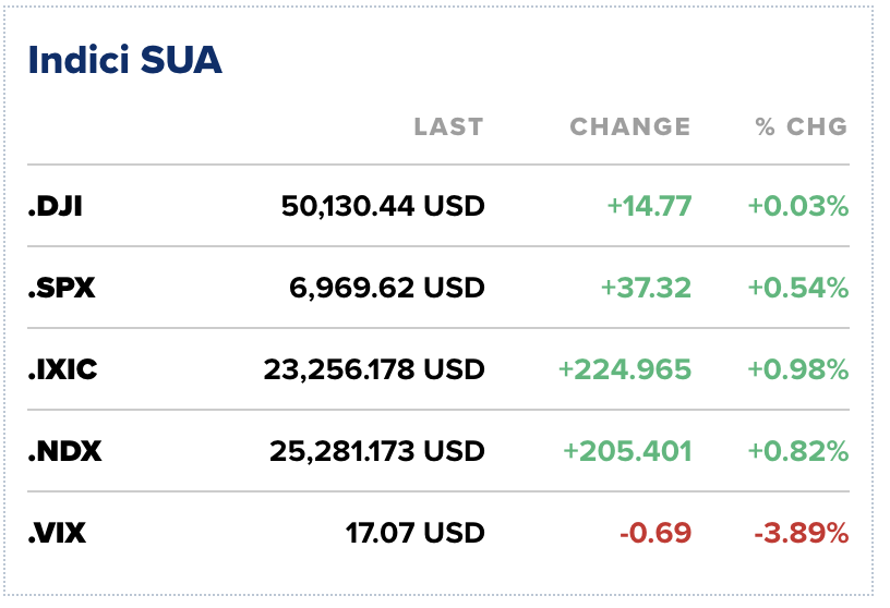 Nvidia și Broadcom au fost, din nou, vedetele pieței continuând seria de câștiguri din ședința anterioară, cu creșteri de 3%, respectiv 4%. Acțiunile companiei Oracle, un alt nume important din zona inteligenței artificiale, au urcat cu 10% după ce casa de brokeraj D.A. Davidson a ridicat recomandarea de la „neutru” la „cumpărare”, invocând optimismul legat de OpenAI și companiile beneficiare.