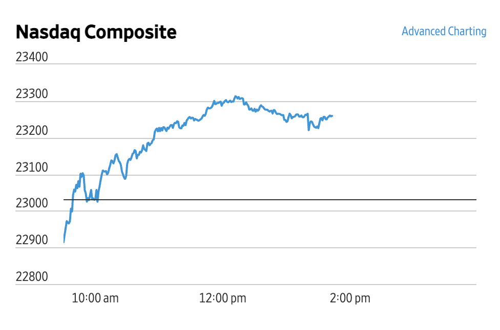 Indicele S&P 500 a urcat cu 0,5%, în timp ce indicele blue-chips Dow Jones era, spre finalul sesiunii, aproape neschimbat, după ce mai devreme atinsese un nou maxim istoric intraday. În același timp, indicele Nasdaq Composite a avansat cu 1%.