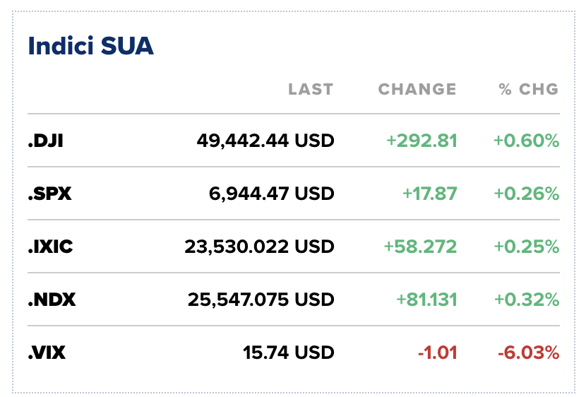 Indicele Dow Jones a câștigat 292 de puncte, adică 0,6%, susținut de aprecierile titlurilor Goldman Sachs și Nvidia, în timp ce S&P 500 și Nasdaq Composite au avansat fiecare cu 0,25%. Închiderea modestă a contrastat cu un start mult mai puternic: în prima parte a zilei, Dow era în creștere cu 0,88%, în timp ce Nasdaq urcase cu peste 1% înainte ca presiunea la vânzare să apară în a doua parte a sesiunii.
