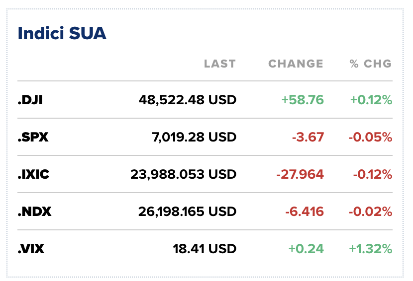 Indicele general al pieței, S&P 500, se situa, spre finalul sesiunii de tranzacționare, în zona de „zero” față de închiderea sesiunii precedente, cu Nasdaq, indicele dominat de companiile de tehnologie, pierzând 0,1%, în timp ce Dow Jones Industrial Average reușea să urce cu 60 de puncte, adică 0,12%. Pe parcursul acestei săptămâni, S&P 500 și Nasdaq au avansat cu peste 3%, respectiv peste 5%, în timp ce Dow a câștigat mai mult de 1%.