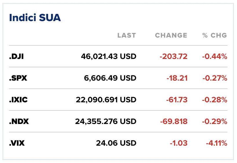 Indicele S&P 500 a scăzut cu 0,27%, la 6.606 puncte, în timp ce Nasdaq Composite a coborât cu 0,28% iar Dow Jones Industrial Average a pierdut 203 puncte, sau 0,44%, închizând la 46.021 de puncte. Indicii și-au revenit de la minimele ședinței, după ce Dow se aflase la un moment dat în scădere cu aproape 500 de puncte, aproximativ 1,1%, iar S&P 500 și Nasdaq consemnaseră declinuri de circa 1%, respectiv 1,4%. Chiar și așa, a fost a doua zi consecutivă de pierderi pentru toți cei trei indici majori.