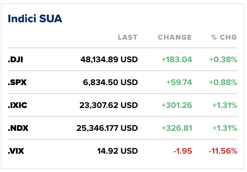Indicele Nasdaq Composite, dominat de companiile de tehnologie, a condus creșterile, avansând cu 1,31% pentru a închide la 23.307 puncte. S&P 500 a urcat cu 0,88%, în timp ce Dow Jones Industrial Average a câștigat 183,04 puncte, respectiv 0,38%, stabilindu-se la 48.134 de puncte.