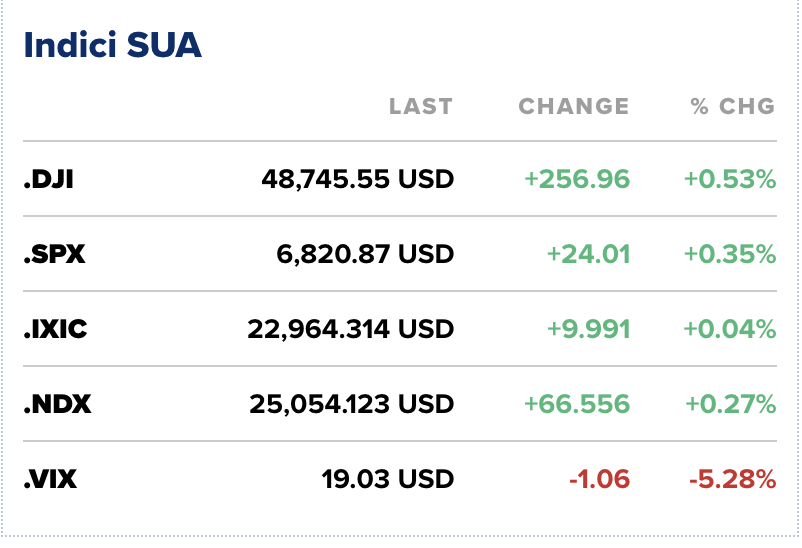 Spre finalul sesiunii de tranzacționare indicele Dow Jones Industrial Average plusa cu aproximativ 250 de puncte, echivalentul a 0,53%, în timp ce S&P 500 creștea cu 0,3%, iar Nasdaq Composite se situa practic „pe zero”.