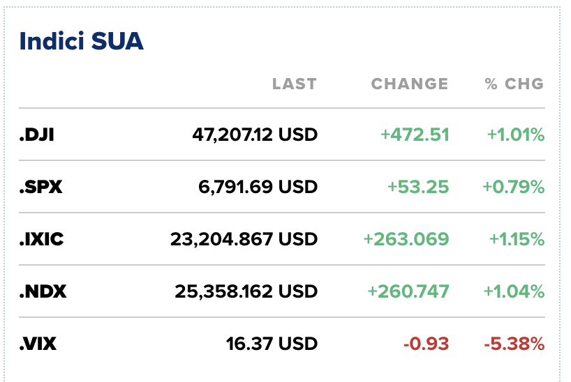 Indicele Dow Jones Industrial Average a crescut cu 1,01%, închizând la 47.207 puncte, marcând astfel pentru prima dată o închidere peste pragul de 47.000 de puncte. S&P 500 a avansat cu 0,79%, ajungând la 6.791 puncte, în timp ce Nasdaq Composite s-a apreciat cu 1,15%, până la 23.204 puncte, toți cei trei mari indici încheind ședința la noi maxime istorice.