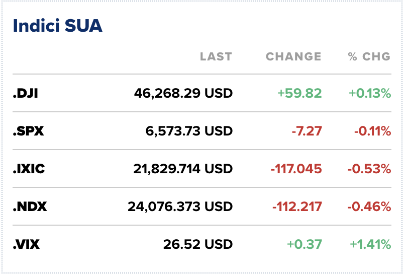 Indicele bursier de referință a evoluat în jurul nivelului de închidere precedent, în timp ce Dow Jones Industrial Average a urcat cu 59 de puncte, sau 0,13%, iar Nasdaq Composite scădea cu 0,5%.