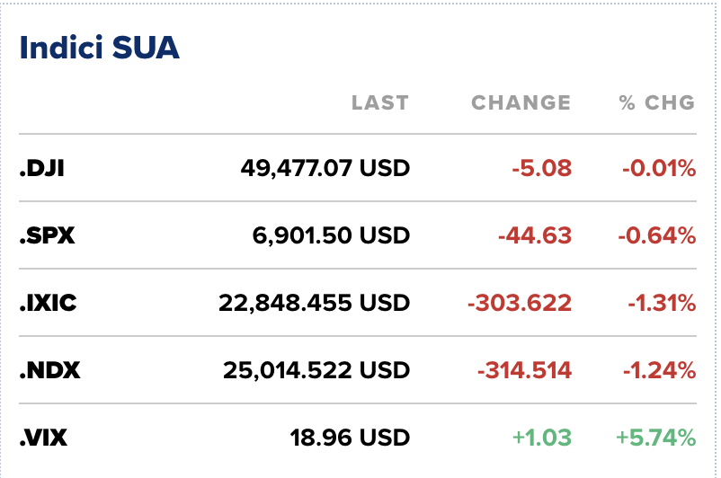 Spre finalul sesiunii, indicele Nasdaq pierdea 1,3%, S&P 500 0,64%, în timp ce Dow Jones Industrial Average a rămas aproximativ neschimbat.
