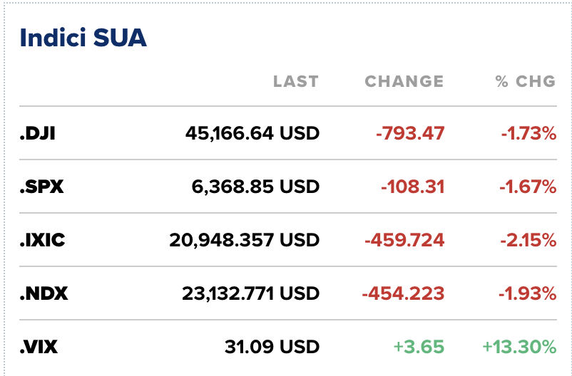 Indicele Dow Jones a scăzut cu 800 de puncte, respectiv 1,73%, închizând la 45.166 de puncte, cu S&P 500 pierzănd ceva mai puțin, adică 1,67%, încheind ședința la un minim al ultimelor șapte luni în timp ce Nasdaq Composite a coborât cu 2,15%, până la 20.948 de puncte.