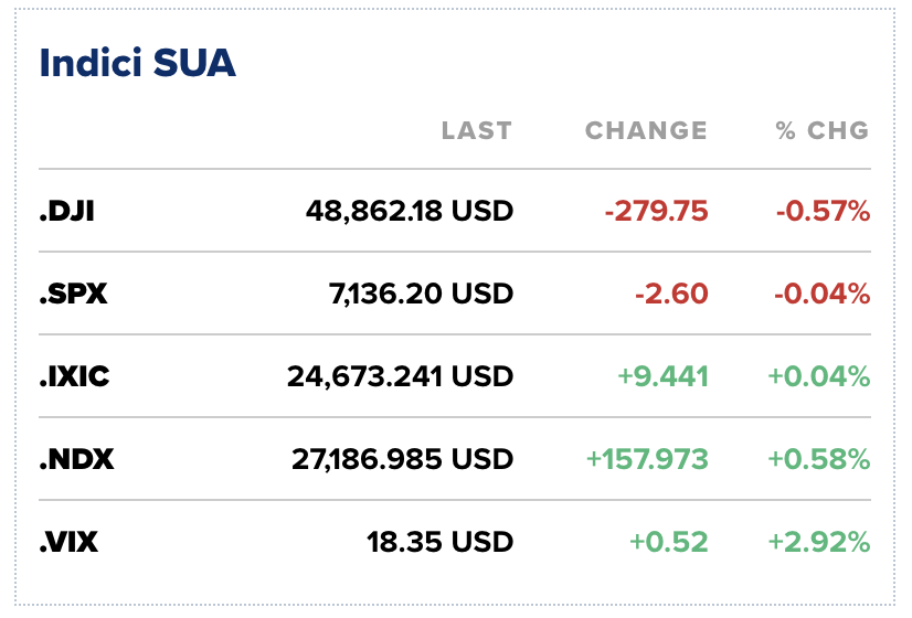 Atât S&P 500, cât și Nasdaq Composite au oscilat în jurul nivelului de închidere precedent, în timp ce Dow Jones Industrial Average a scăzut cu 280 de puncte, sau 0,6%, tras în jos de scăderile înregistrate de Boeing și Goldman Sachs.