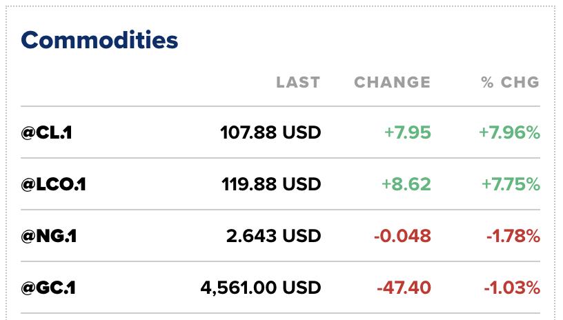 Contractele futures pentru țițeiul West Texas Intermediate au urcat cu 8%, tranzacționându-se la 107,80 de dolari pe baril, în timp ce benchmark-ul internațional Brent a avansat cu 7,8% la aproape 120 de dolari pe baril.