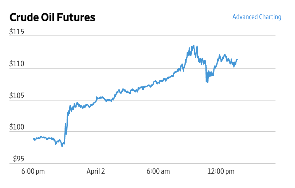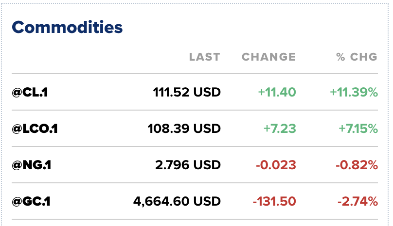 Contractele futures pentru țițeiul West Texas Intermediate au urcat cu 11,39%, la 111,5 dolari pe baril, în timp ce sortimentul Brent, reperul internațional, a crescut cu peste 7%, la 108,39 de dolari pe baril.