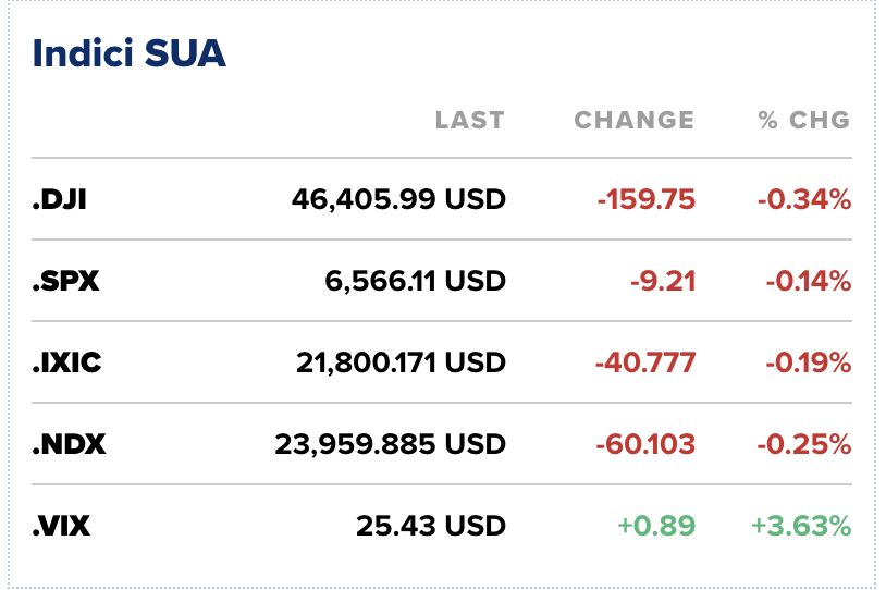 Indicele Dow Jones pierdea, spre finalul sesiunii, peste 150 de puncte, adică 0,34%, în timp ce S&P 500 și Nasdaq Composite scădeau fiecare cu aproape 0,2%.