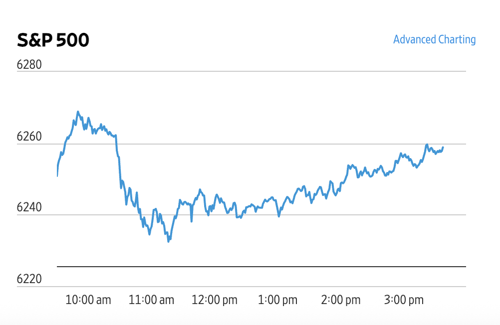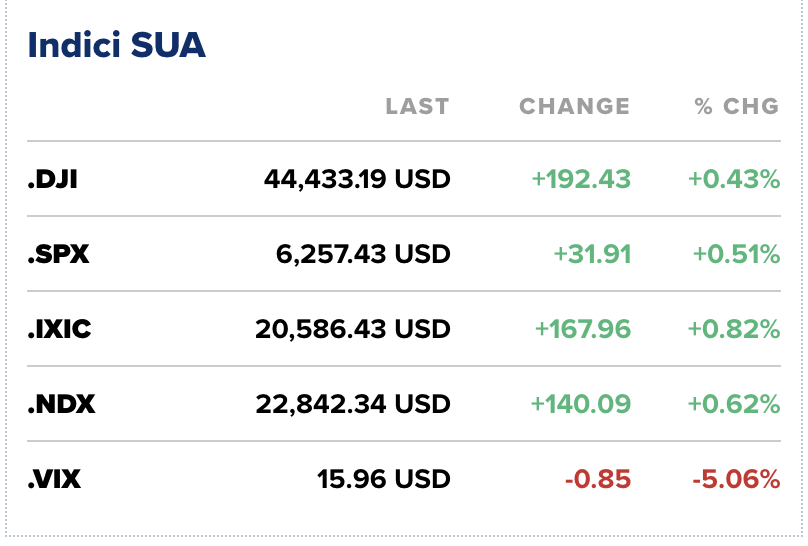 - Indicele S&P500 este pe plus, condus de sectorul tehnologic: plusează cu peste o jumătate de procent, la 6.257 de puncte, cu indicii Dow Jones și Nasdaq 100 crescănd, la răndul lor, cu 0,43%, respectiv, 0,63%;
